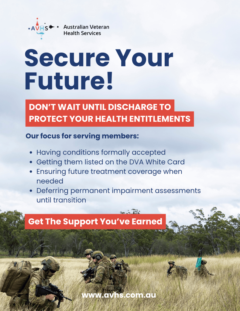 Here’s what every serving member needs to understand: DVA is significantly more likely to accept claims submitted while you’re still serving. This isn’t about seeking immediate compensation or gaming the system, it’s about securing your future health coverage when the evidence is fresh, the witnesses are available, and the connection to service is undeniable.